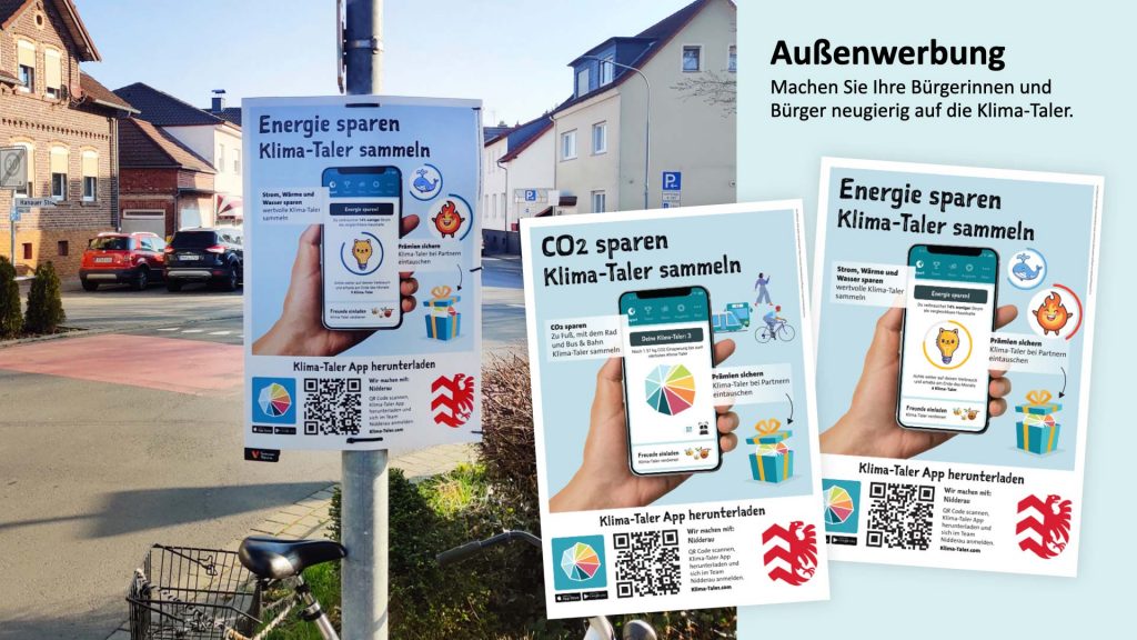 Der Klima-Taler wird mit einer öffentlichkeitswirksamen Kampagne begleitet. Alle Materialien dafür sind vorhanden und können direkt eingesetzt werden. Mitarbeitende, lokale Unternehmen und Bürgerinnen werden aktiv eingebunden. Das für alle sichtbare Dashboard zeigt, wo welche Einsparungen von CO2 erfolgreich sind. So wird die Kommune nicht nur als Planer und Entscheidungsträger sichtbar, sondern als lebendiges Vorbild, das nachhaltiges Handeln vorlebt und Bürgerinnen und Bürger unterstützt, die aktiv mitmachen.